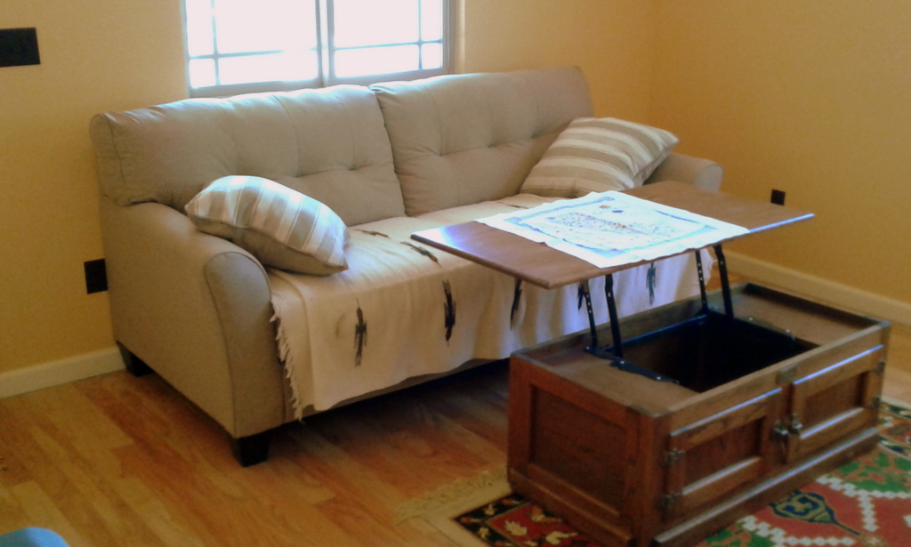 | The coffee table, gift from Julie Schaefer and "Bubba," does a cool trick for dining on the couch. |