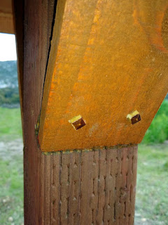 Diagonal bracing is notched into the post and held in place with what boatbuilders used to call "trunnels" (tree nails) - wooden pegs, round(ish) for most of their length to be driven into a drilled hole, and left square on the outer end to bite into the wood like the head of a nail.